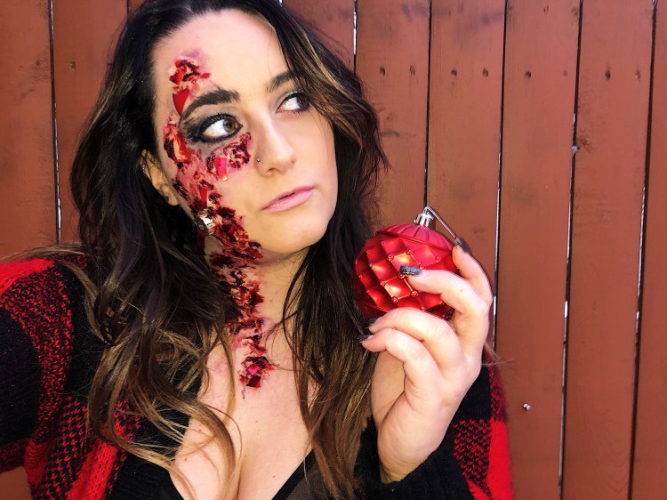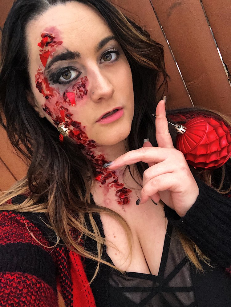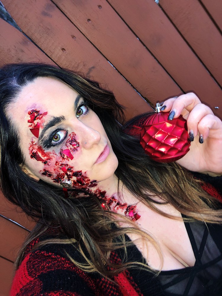 This look was just me having some quick fun. I used Ben Nye nose and scar wax and his scab blood as well. I broke a real ornament and inserted the pieces into the wax and used some liquid latex to help. This was pretty dangerous seeing as I just stuck glass in my face (very carefully!) I wouldn’t suggest trying this one at home. It was a fun look and I was so excited to get to do something #morbid and #horrid for Christmas time.