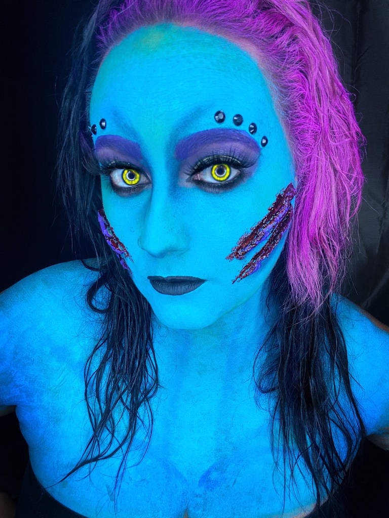 While letting the gills dry, I just did a simple smoky shadow and cut crease. I used a light and dark purple, and a navy blue. For the crease I just used a pigmented sparkly white. After that I used the light purple eyeshadow from my eyes to do some contouring. The way that the shadow reacted to the paint was awesome. It turned this darker purple blue color that blended well with the look. The eye shadow doesn’t look that color on my eyes because I did not cover my eyes with the body paint!