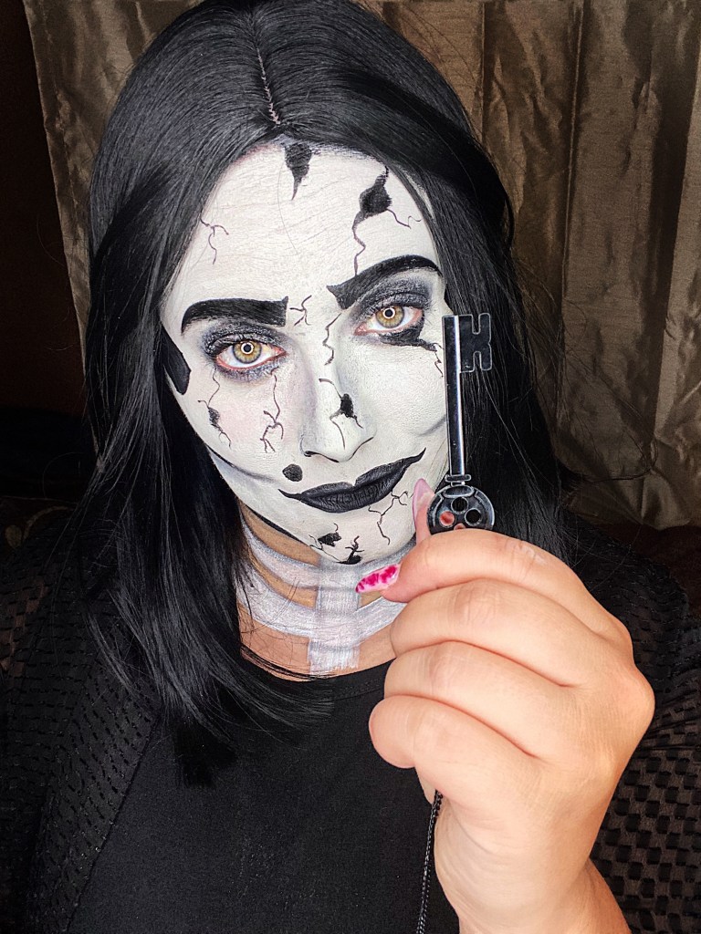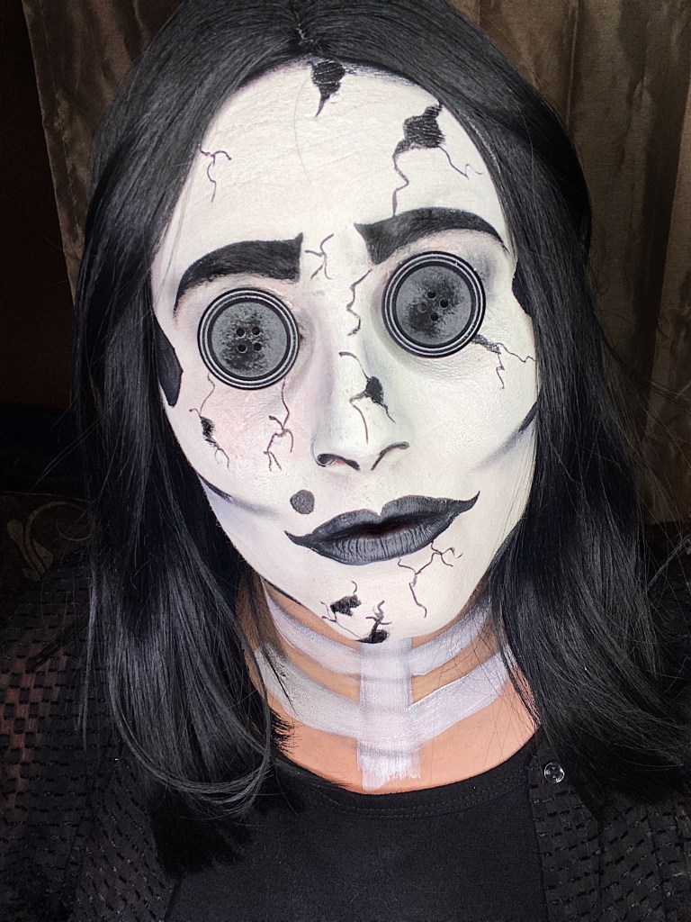 I then painted on my eyebrows and outlined my neck lines and used liquid eyeliner pen for the cracks. Trying to take a picture with the buttons on was extremely difficult. I couldn’t see anything! I stuck some latex on the top of the buttons and they kept falling off. But I got a few good shots!