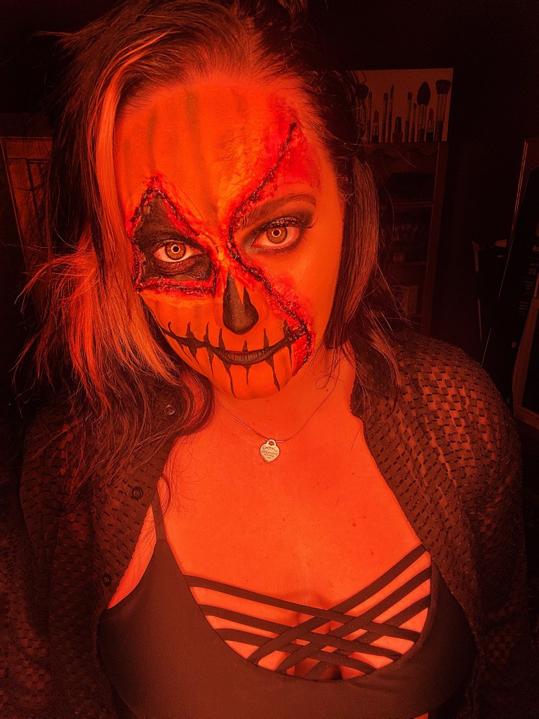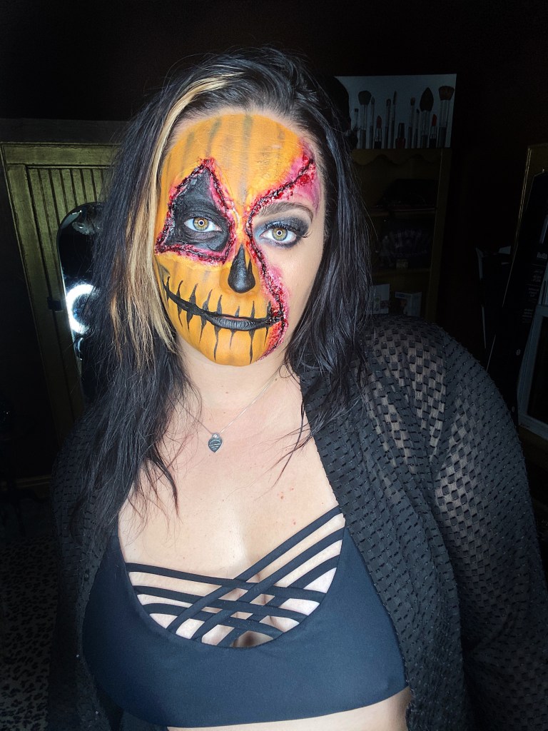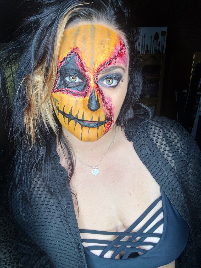 I’ve been wanting to put my own twist on pumpkin makeup for a while now. Originally I was going to do a full face but I changed my mind. I like half face makeup sometimes because it actually gives me more to work with because I get a “seam.” This look took longer than usual because I finally got to play with my scar wax which I haven’t gotten to do yet! It was hard at first but I got used to it.