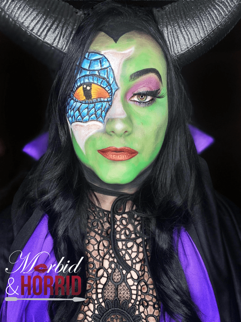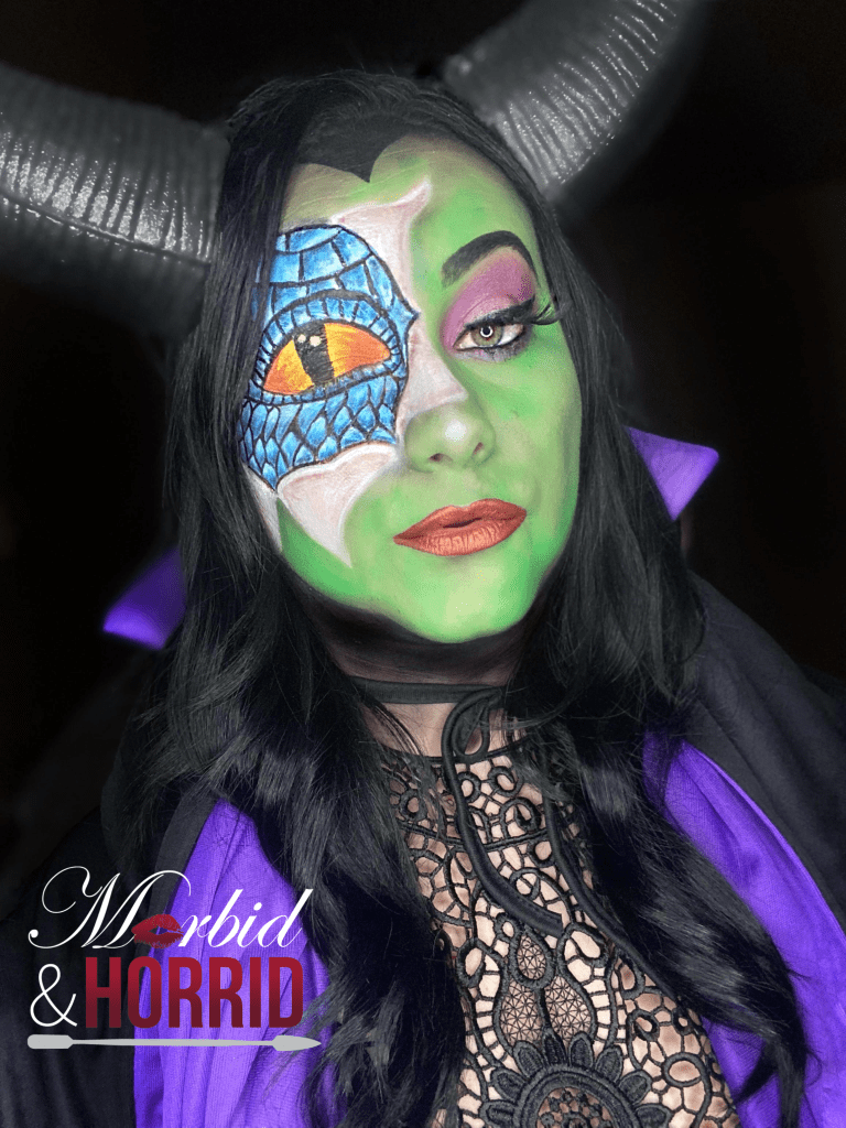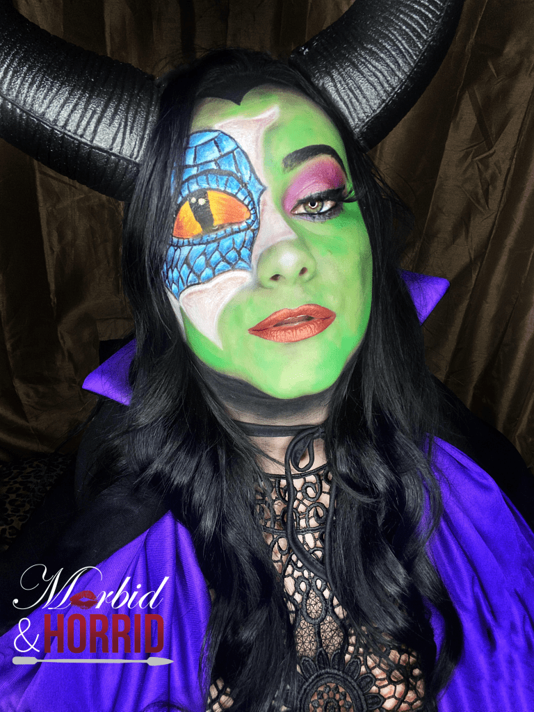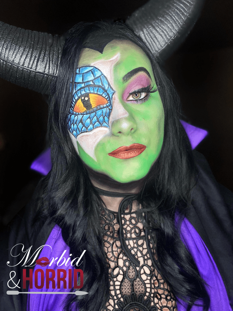 Once the green was down, I did my purple Smokey eye with eyeliner and added a lash and lips. I also contoured with a black eyeshadow. Added some highlighter and painted my brow black so it was extra prominent. Put on my costume and there she WAS 🖤