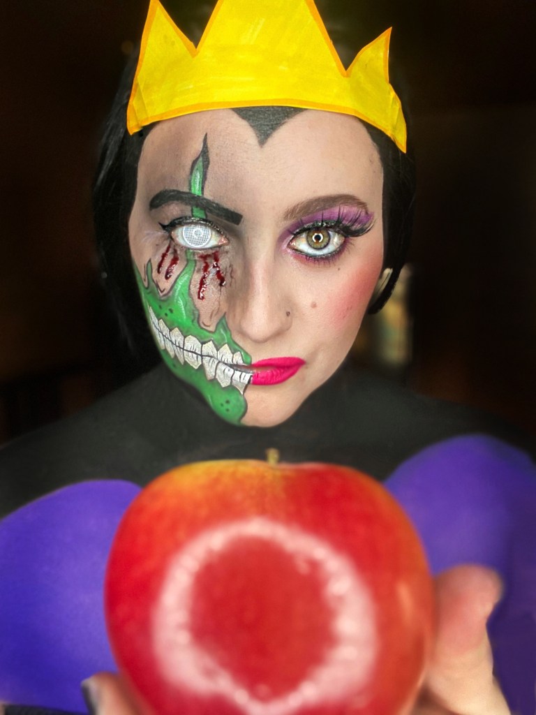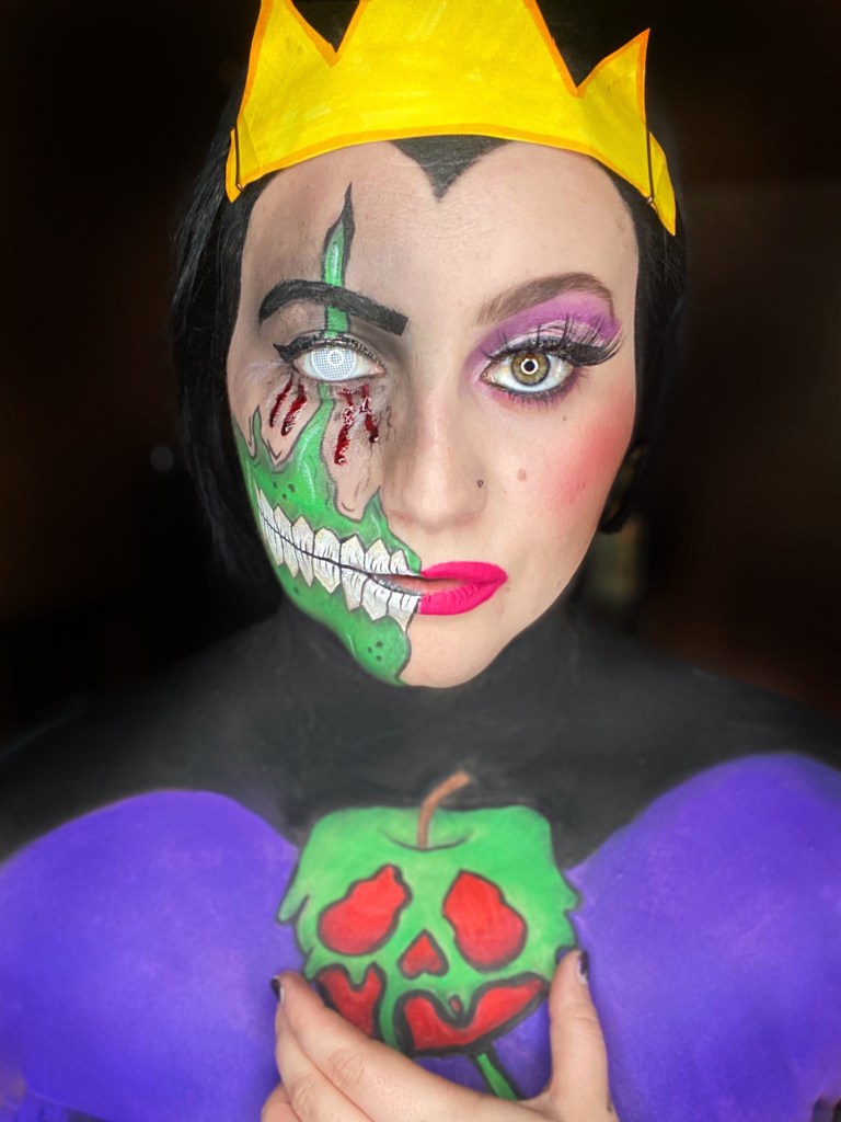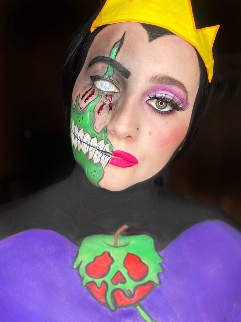 Once everything was painted, I just shaded. A lot! Lol. Using a dark green and dark red eyeshadow. I had to add some blood and a contact to pull it all together! PS yes I made the crown. It’s just paper and marker lol.