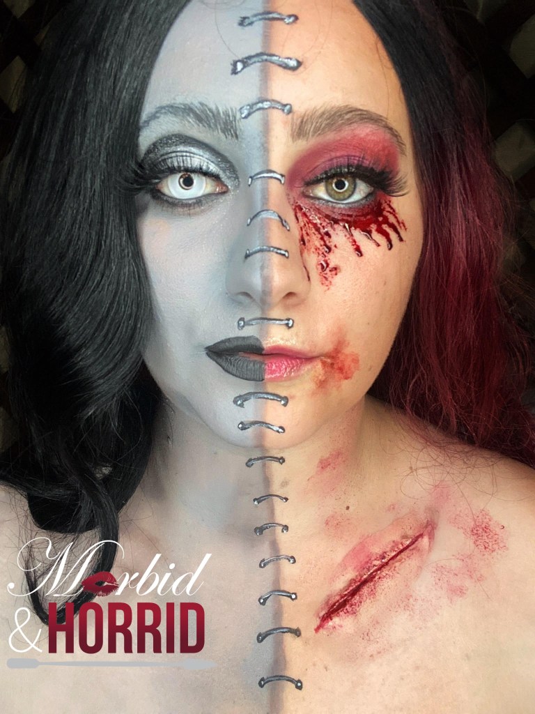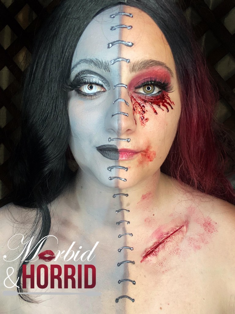 Finishing touches were lashes, a contact, and some more blood! I also wore my maroon wig. I added my black extensions to the grayscale side because the red didn’t look right!