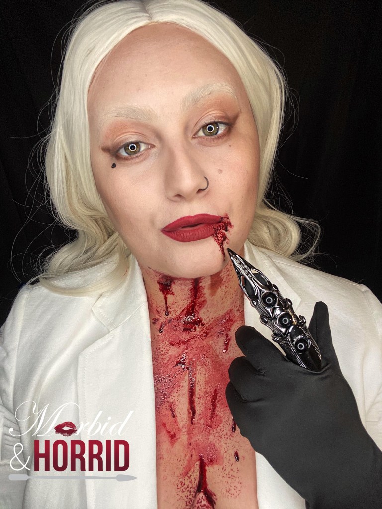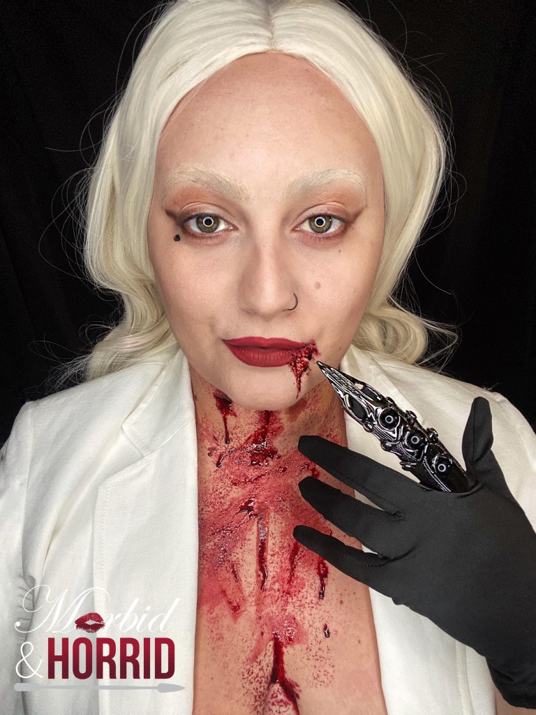 This is basically just a glam look with blood all over it. I copied a photo of the countess that I wanted to re create, the best I could. Her eyebrows are basically non existent and platinum blonde. Obviously this was an issue for me.
