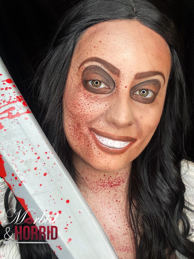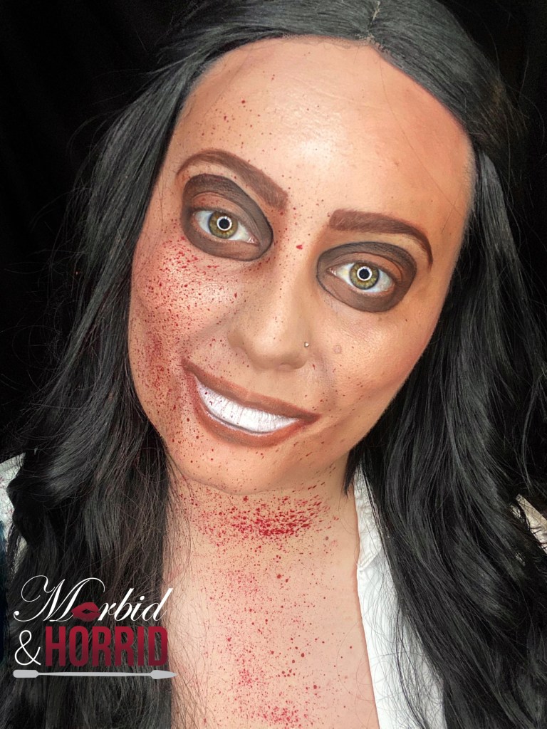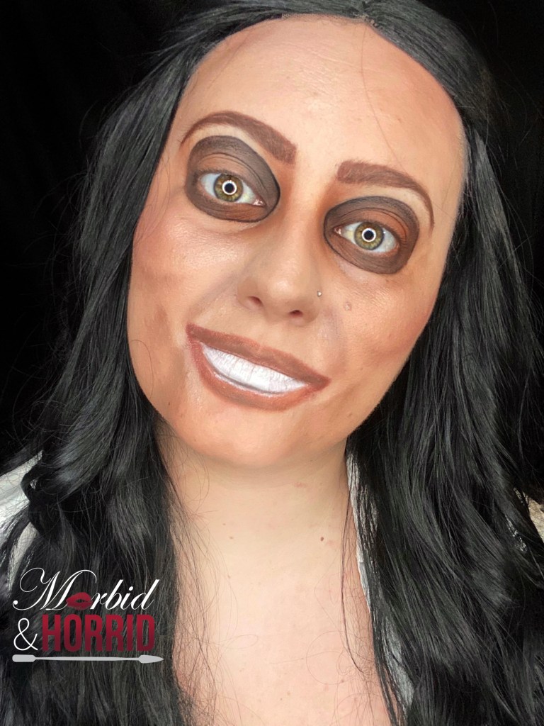 Then comes the contouring. LOTS of contouring lol you have to look at a mask and see where you want the contours. They have a defined mouth line and big cheeks. So first, I did a light layer of eyeshadow to map it all out, then went in with a darker brown to fill it all in. I also added dark gray.