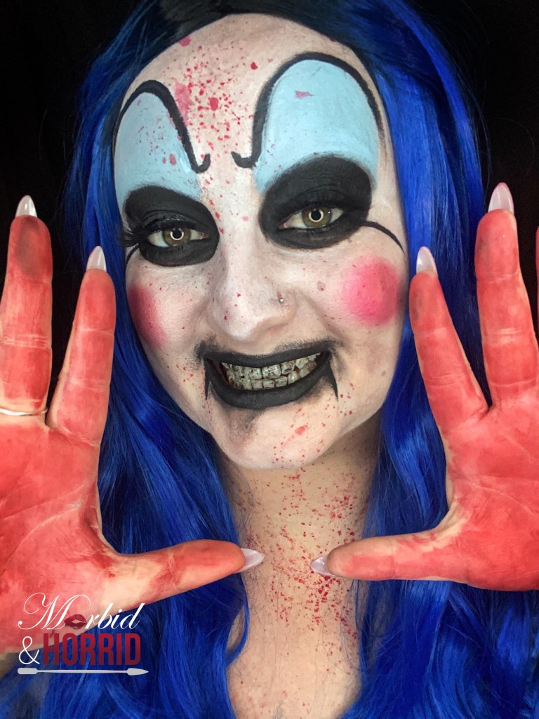 I glued my brows down to camouflage them a bit and then filled in all of my extras. I added the blood spatter, well if you don’t know, go watch.