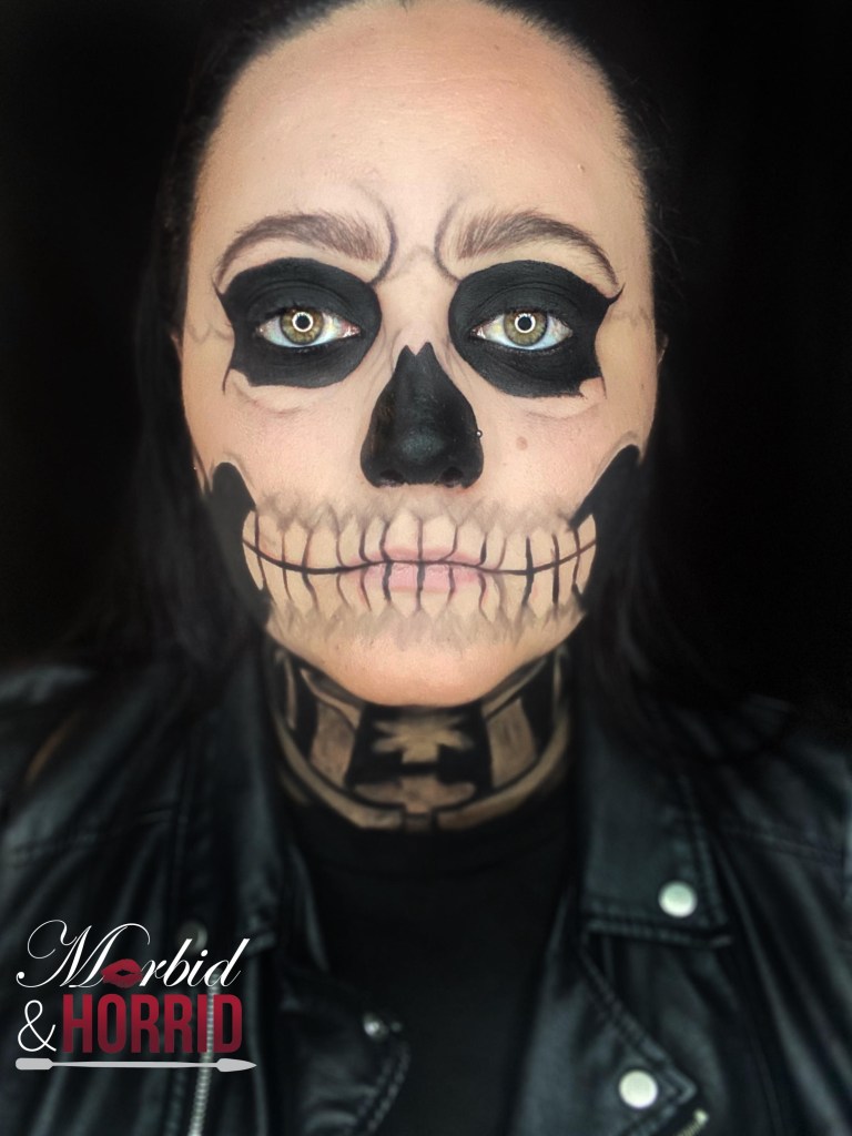 I used a lip liner to outline the eyes, nose and mouth. Then filled it all in with a black paint and set with black eyeshadow.