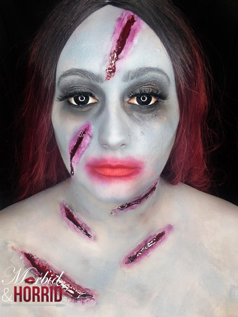 For my gray base, I painted that on with a sponge in a dabbing motion. I like how my chest is not “full coverage” that gives it some dimension. For more dimension I also dabbed black and gray eyeshadow all over. The eyes are a simple black eyeshadow smudged all over and the lips are the same except red. Now, I should have cleaned up the gray and then did my lips because as you can see, my lips are red and the smudges are purple from mixing with the gray but ya girl got a little lazy. IM SORRY! But if I do the 13 Ghosts collection I will totally add her in š