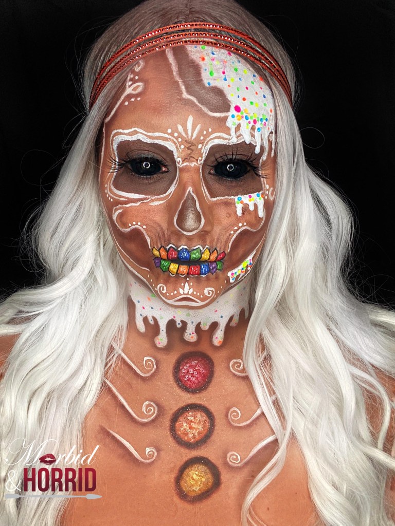 Definitely had to glue down the brows for this one. I then drew out all of the bigger details like where the frosting would go, and the skull lines.